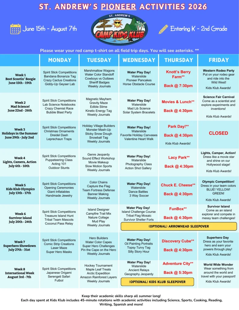 Our Summer Camp at St. Andrew’s runs from June 15 through August 7 and serves campers entering Kindergarten through 9th grade. Campers are grouped by age and rotate throughout the campus to enjoy a wide variety of activities, with new themes each week. Campers also enjoy weekly field trips, giving them exciting off-site adventures, and have the opportunity to participate in optional overnight experiences for an extra dose of fun and independence. With caring staff and a strong focus on safety, structure, and fun, this location provides a supportive environment where campers can explore new interests, build friendships, and create