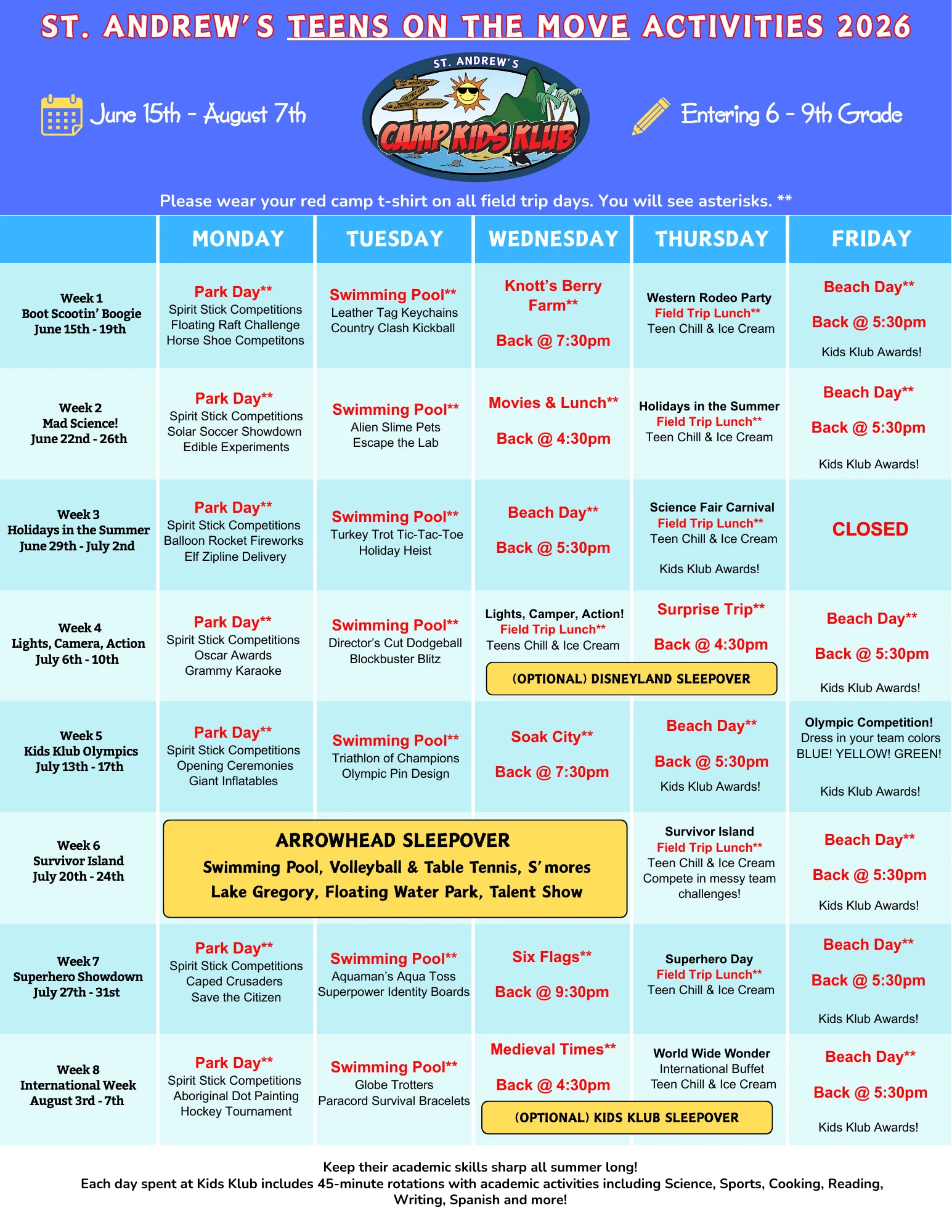 Join us for the ultimate Kids Klub sleepover! The fun doesn’t stop when the lights go down our space transforms into a night full of excitement just for campers. Bring your sleeping bag, pajamas and get ready for games, popcorn, an exclusive camp video, and nonstop laughs with friends. Campers will enjoy a delicious dinner and sweet treats, plenty of surprises along the way, and a cozy night spent making memories that feel just like a classic sleepover Kids Klub style!